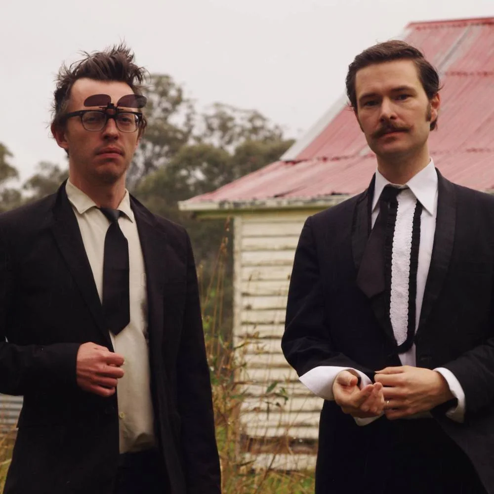 Two broken bass drums. Two broken guitars. Two broken gentlemen.