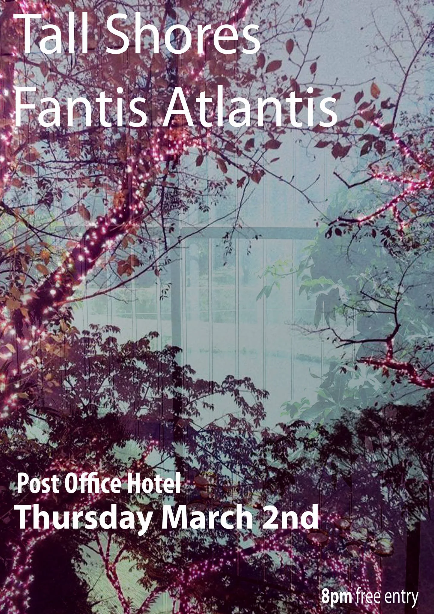 Tall Shores // Fantis Atlantis Thursday 2 March 2017 9:00 pm 11:00 pm 21:00 23:00 Google Calendar ICS Tall Shores will be playing their first show of the year after recording their forthcoming album and are excited to be joined by Neddwellyns - Fantis Atlantis just before their tour to New Zealand. Free entry and excellent vibes.