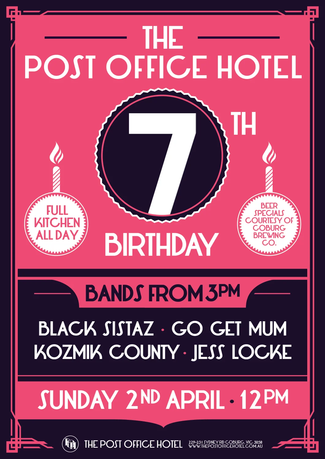 The Post Office Hotel is turning 7 this year and to celebrated we've got a whole cross section of bands playing at the pub. Kitchen will be rocking all day, plus we'll have a DJ in the beer garden all afternoon. Make sure you get on down to this community gig and show your love for Coburg's faviourite watering hole. Music starts at 2pm and runs though till 7pm and below is who we've got playing for ya!